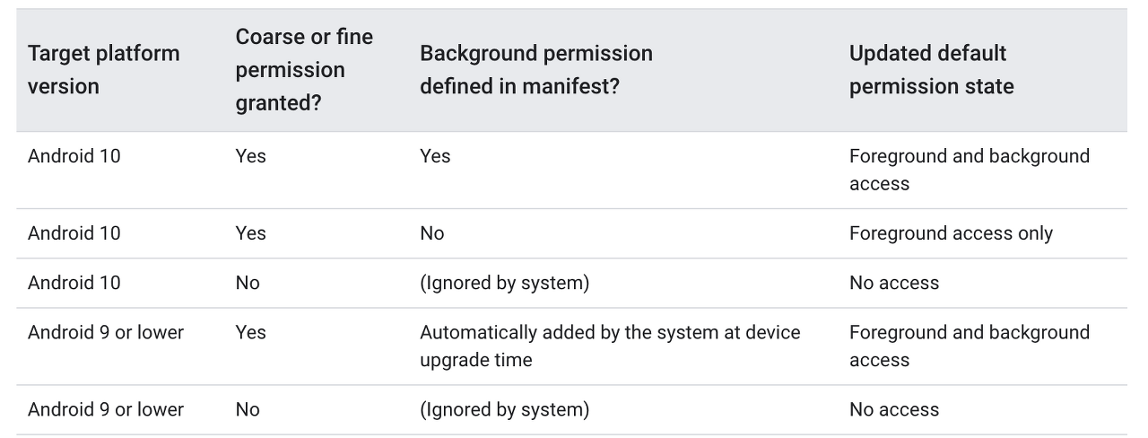 옵션만 존재합니다. 대신 사용자는 설정 페이지에서 백그라운드에서 위치 정보가 필요하다면 Manifest에서 BACKGROUND 권한을 받아서 아래의 이미지의 요구에 따라야 합니다. 또 권한을 거부하더라도 앱 사용에 지장이 없도록 해야 합니다.