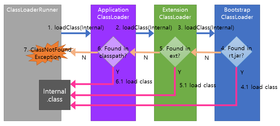 - 다시 Extension ClassLoader는 Internal을 최상위의 Bootstream ClassLoader에 위임합니다.