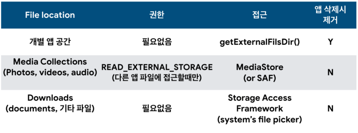 MediaStroe은 추가 권한 없이 사용가능하며, 다른 앱이 저장한 콘텐츠를 보기 위해서는 READ_EXTERNAL_STORAGE 권한이 필요합니다. 그 외의 파일들은 System File Picker(시스템 기본 파일 선택기)를 통해 접근합니다. 사용자가 다른 앱에서 보지 않아도 되는 파일이나, 앱이 제거 된 이후, 유지될 필요가 없는 파일은 MediaStore를 사용하면 안됩니다.