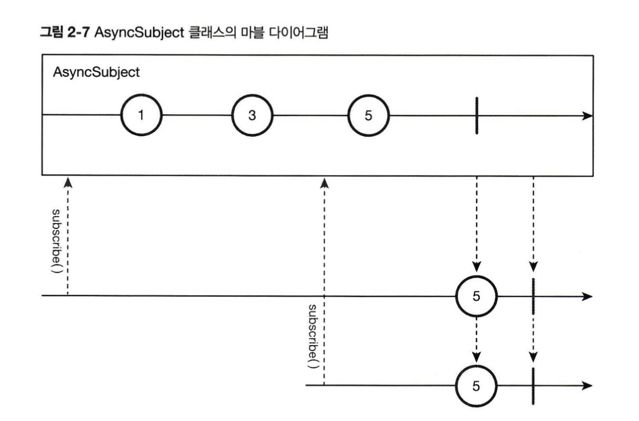 AsyncSubject 클래스는 Observable에서 발행한 마지막 데이터를 얻어올 수 있는 Subject 클래스입니다. 완료되기 전 마지막 데이터에만 관심이 있으며 이전 데이터는 무시합니다.