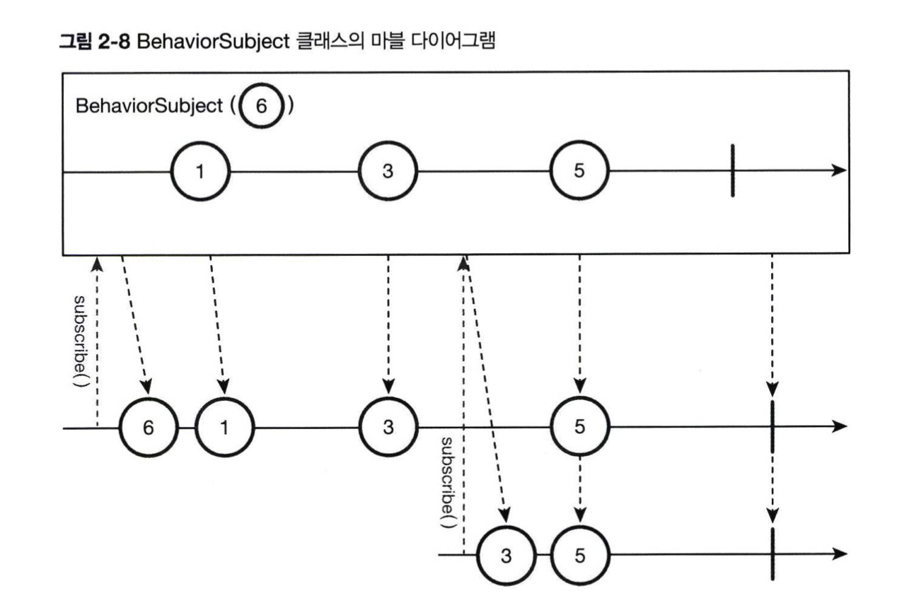 BehaviorSubject 클래스는 AsyncSubject 클래스와는 다르게 createDefault() 힘수로 생 성합니다. 구독자가 subscribe() 함수를 호출했을 때 그전까지 발행한 값이 없다면 기본값을 대신 발행해야 하기 때문입니다.