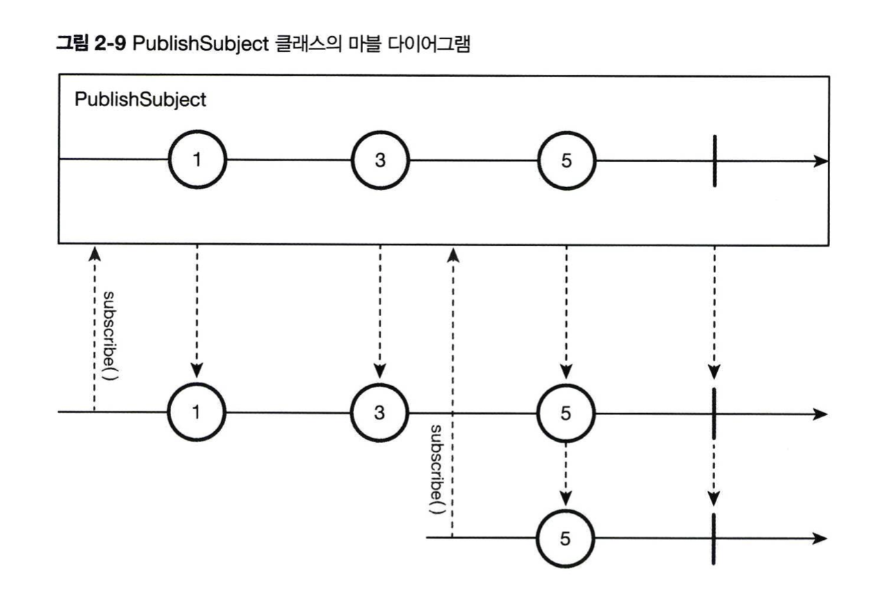 PublishSubject 클래스는 별도의 기본값을 제공하지 않으므로 AsyncSubject 클래스처럼 create() 함수를 호출해 생성합니다.
