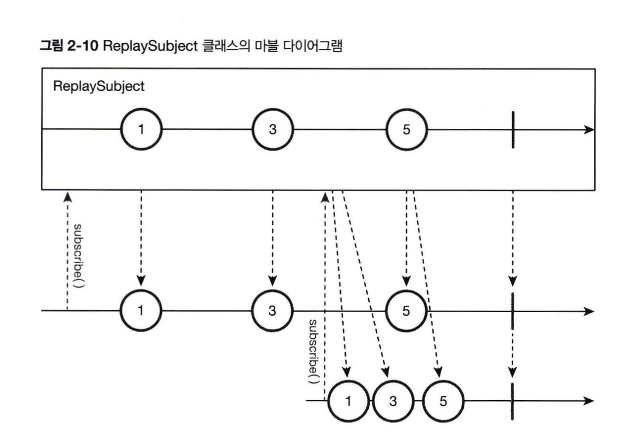 마지막으로 소개할 Subject 클래스는 가장 특이하고 사용할 때 주의해야 하는 ReplaySubject 클래스입니다. Subject 클래스의 목적은 뜨거운 Observable을 활용하는 것인데 차가운 Observable처럼 동작하기 때문입니다.