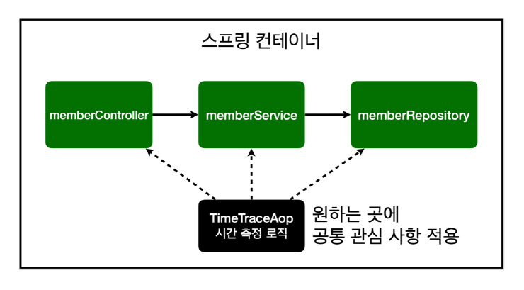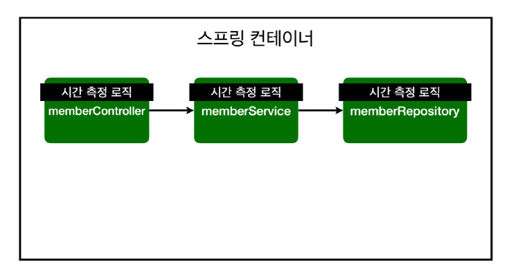 그림으로 설명하자면 아래와 같이 Controller, Service, Repository에 모두 시간 측정 로직이 존재할 경우 AOP를 활용하여 공통의 관심사항을 적용할 수 있습니다.