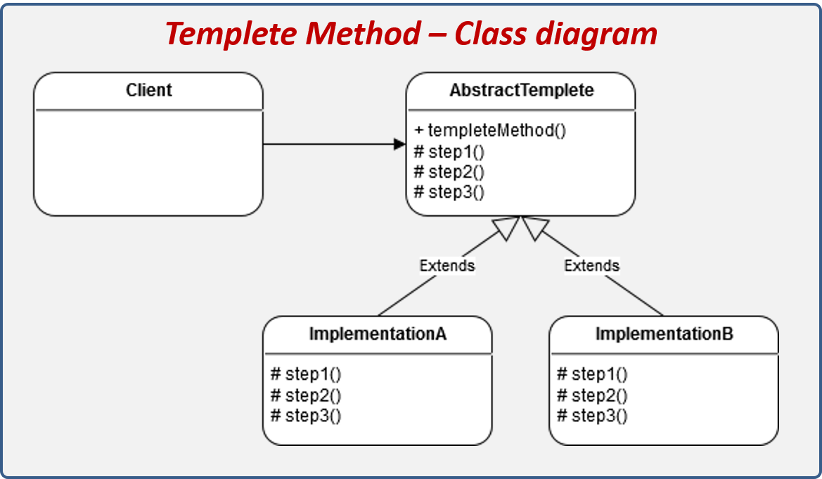 상속을 통해 슈퍼클래스의 기능을 확장할 때 사용하는 가장 대표적인 방법입니다. 변하지 않는 기능은 슈퍼클래스에 만들어두고 자주 변경되며 확장할 기능은 서브클래스에서 만들도록 합니다. 알고리즘의 구조를 정의하고, 하위 클래스에서 알고리즘 구조의 변경없이 알고리즘을 재정의 하는 패턴입니다. 쉽게 말해 전체 구조는 바꾸지 않으면서 특정 단계를 수행하는 내역을 바꾸는 패턴입니다. 상속 관계(Is-a)를 이용합니다.
