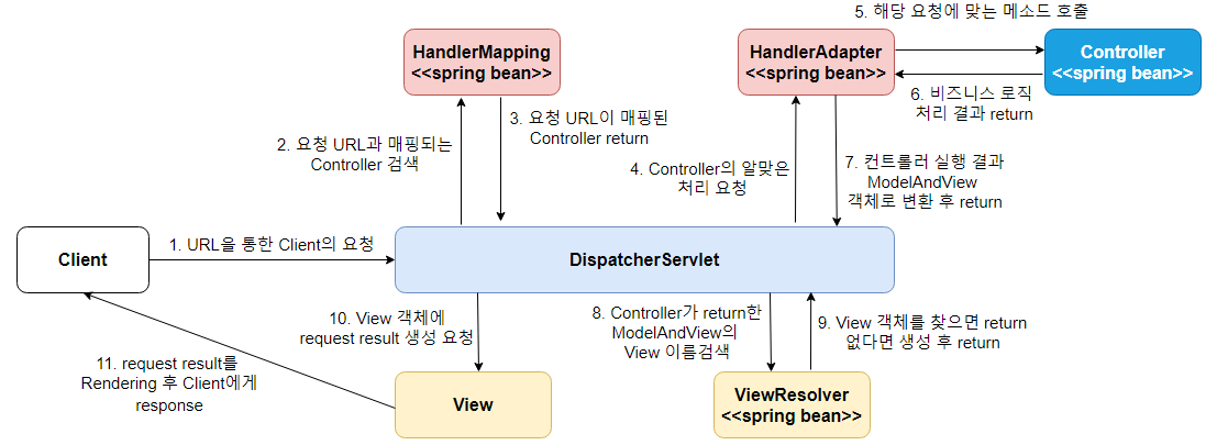 - DispatcherServlet은 HandlerMapping으로부터 리턴받은 결과(Controller 빈 객체)를 HandlerAdapter에게 요청 처리를 위임합니다.
